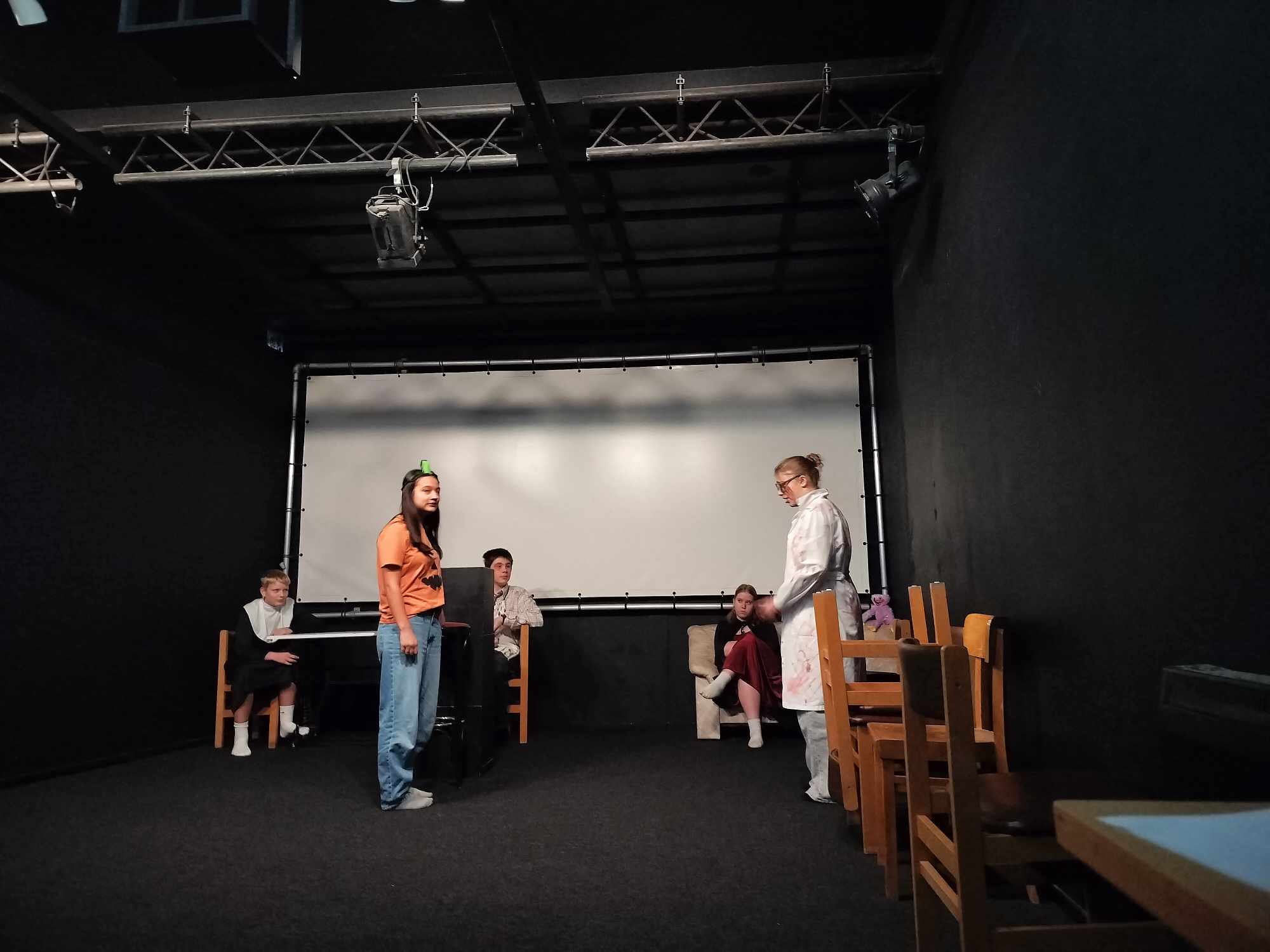 Tijdens de wekelijkse lessen komen we samen om aan de hand van praktische oefeningen toneelervaring op te doen.